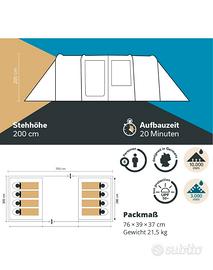 Vendo tenda da campeggio a tunnel beige adatta a 8/12 persone con 2 stanze da letto ai poli opposti. Altezza max 2mt, quindi si sta bene in piedi! È possibile fare spedizione con spese a carico dell'acquirente. È possibile vederla montata presso il mio domicilio a Vigonovo, solo a persone realmente interessate, no curiosi, poiché il montaggio e smontaggio richiedono tempo. Vendo a 320 euro (su Amazon oggi costa 399 euro). Ulteriori foto in pvt