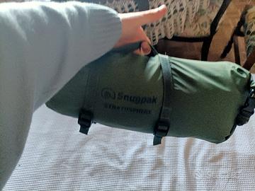 Tenda canadese verde modello Snugpak Atmosphere. Progettata per il bivacco anche in condizioni avverse, è facile e veloce da montare e smontare e ha una resistenza all'acqua di 5000 mm per il tessuto superiore e 8000 mm per quello inferiore. Monoposto (interni 220 cm lunghezza, 80 cm larghezza, 44 cm altezza), la sua caratteristica principale è la sua compattezza e leggerezza: pesa in totale 1,13 kg.