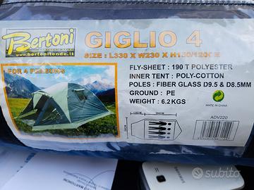 tenda bertoni da 4posti più volendo avrei a parte anche due sacchi a pelo estivo un'altra tenda igloo 3posti ( ma meglio x due) che chiusa rimane corta ottima x trasporto in moto o bici ,e anche due materassini