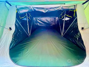 Dotata di sacche laterali per stipare oggetti, finestre con rete per passaggio di aria senza far entrare la pioggia o zanzare, dispone già di materasso comodo. Si puó tranquillamente chiudere con dei sacchi a pelo dentro o un piumone senza togliere ogni volta, é assolutamente impermeabile, provata sotto due acquazzoni memorabili, non é entrata una goccia nemmeno dalle finestre che sono riparate.