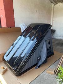 Gusci in Vetroresina: fibra di tessuto intrecciata ed impregnata di sostanze resinose liquide. Non assorbe calore, non scalda, è isolante, stabile, resistente e perfettamente riparabile. Sottotetto: struttura con intercapedine, per un vero isolamento termico, acustico e per un ambiente salutare più silenzioso in caso di pioggia. Base: struttura "sandwich" con 2 barre in acciaio. Quattro maniglie integrate per una facile movimentazione della tenda. Tessuto: AIRTEX® made in Germany Sistema di apertura e chiusura: a 2 molle a gas perfettamente dimensionate a qualsiasi temperatura climatica. Ganci di chiusura dei gusci: in acciaio con serraggio registrabile. Materasso: in gomma spugna densità 25 kg/m³ indeformabile e sfoderabile per mezzo di zip. Fodere materasso e cuscini: tessuto 100% in cotone coordinato al modello