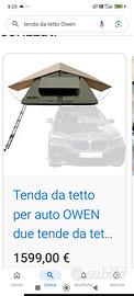 vendo tenda da tetto per auto owen, un anno di vita praticamente nuova utilizzata pochissimo. vendo 1000 euro pagata 1500. preciso che la marca Owen e leader nel mondo delle tende da tetto i materiali utilizzati sono il top di gamma,nulla a che vedere con le tendine in vendita online. la tenda è completamente impermeabile dotata di zanzariere a 360° e vista cielo panoramica. all'interno è presente materasso in lattice 20 cm di spessore rete porta indumenti e diversi vani porta oggetti. più due tasche esterne porta scarpe