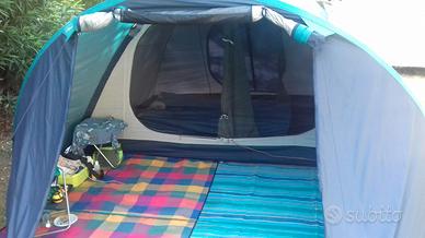 Vendo tenda Ferrino Halley 5, causa inutilizzo (utilizzata un paio di volte). E' una tenda mega-igloo, altezza massima interna cm 1.90, 5 comodi posti, spazio interno divisibile in due "stanze", ampio abside ottimo per cucinare in caso di maltempo, come deposito bagagli, zaini, o per tavolino con sedie all'ombra e riparato dalla pioggia ecc. Struttura autoportante, facile da montare. 3 entrate: 1 laterale, 1 frontale con tetto e finestra chiudibile, 1 posteriore. Falde del telo esterno ripiegabili, tasche interne, ganci per lampada, zanzariere. Doppio tetto in nylon alluminato termoisolante, interno in tessuto cotone-nylon idrorepellente e traspirante, pavimento in nylon. 3 pali in vetroresina precollegati con cavetto elastico. Cuffie di ventilazione, tiranti controvento. Ideale per campeggio stanziale per piccoli gruppi o famiglie con bambini. Compreso nel prezzo due teli in rafia 2,5mx3,5m da pavimento. Prezzo non trattabile.