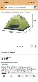 Tenda da trekking o campeggio per tre persone , usata solo due volte, uno dei bastoncini ad arco è da cambiare
