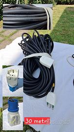 •Cavo elettrico di grosso diametro della lunghezza di trenta metri per collegamento di prese elettriche dalla tenda a colonnina di distribuzione del campeggio, compreso adattatore industriale tre poli/shuco;