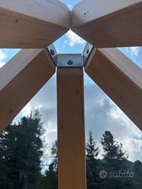 Tenda glamping del brand “Tipì Glamping Experience” completa di struttura in legno lamellare dotata di piedini regolabili in altezza, paviemento in multistrato e copertura.