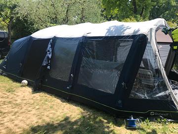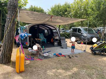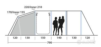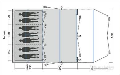 Tenda+telone pavimento+tappetointerno valore nuovo 3000Euro La tenda familiare Wood Lake 7ATC della collezione gonfiabile Imperial Air del marchio danese Outwell offre posti letto fino a 7 persone. La struttura gonfiabile Rigid Air System è composta da camere d'aria separate e preformate. Tale costruzione garantisce la stabilità della tenda e, grazie all'altezza di 220 cm e alla volta gotica, la libertà di movimento all'interno dell'anticamera. La tenda Tropico è realizzata in una miscela traspirante di cotone e poliestere Outtex® Airtech con trattamento idrorepellente, mentre una fodera in poliestere appositamente incollata protegge dal freddo e dall'umidità del terreno. Questa pavimentazione si trova in ogni stanza. L'ampio ingresso panoramico con zanzariera permette di entrare nella tenda senza ostacoli e di aprirla a piacimento grazie alle quattro cerniere. Dietro questo ingresso si trova un ampio portico coperto, separato dal corridoio da una porta magnetica con sistema Quick and Quiet. Oltre all'ingresso principale, è possibile accedere alla tenda anche attraverso due ingressi laterali che conducono a un ampio corridoio. La luce diurna è garantita da un tetto leggero e da ampie finestre oscurate che proteggono dalla luce solare diretta e dai raggi UV. Se si desidera una maggiore privacy, è sufficiente chiudere le tende all'altezza desiderata della finestra. Le tre spaziose camere da letto principali possono ospitare comodamente fino a 7 persone. I soffitti e le pareti oscurati offrono comfort e tranquillità durante il sonno. Alla camera da letto si accede attraverso un'ampia porta che può essere aperta in due modi. Il primo è il sistema Quick and Quiet, che consente un'apertura rapida e silenziosa della porta grazie a strisce verticali magnetiche.
