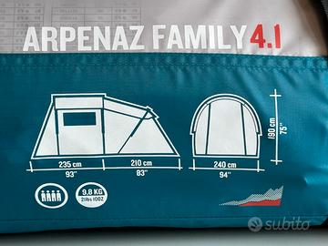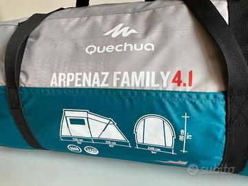 Tenda Quechua ARPENAZ FAMILY 4.1 (4 persone) 1 soggiorno e 1 camera. La tenda è stata usata UNA SOLA VOLTA per 3gg. Questa tenda per 4 persone si monta rapidamente grazie ai riferimenti colorati. Il soggiorno ha un'altezza sufficiente per stare in piedi comodamente e concedersi un momento conviviale all'interno.