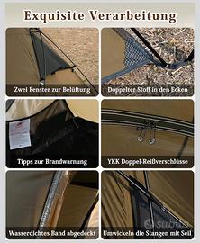 Stabile e durevole: tenda esterna in nylon 380T, fondo in poliestere Oxford 210T, buona resistenza agli strappi. Aste in alluminio 7001, piedini anticorrosione, con 6 corde per la stabilità!