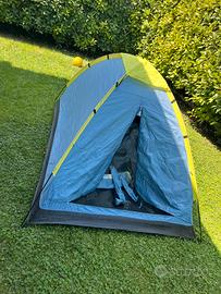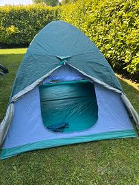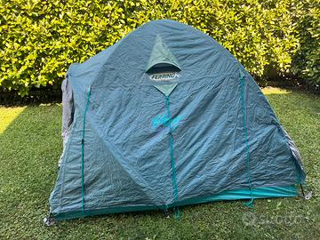 - Ferrino trekking da 3 posti, con possibile tunnel anteriore (in foto arrorolato sopra l’ingresso anteriore) per ricovero bici, zaini, scarpe, dispensa.
