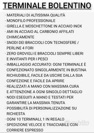 Salve... Realizzo a mano terminali da bolentino costiero e da bolentino di profondità. Terminali anti groviglio, realizzati con tecnosfere / perline 4 fori, per evitare grovigli. Quindi sono terminali tecnici e professionali e allo stesso tempo adatti anche ai principianti, in quanto, non creando grovigli, rendono facilissimo il loro utilizzo. Altro aspetto fondamentale sono i braccioli: non aggrovigliandosi, lavorano alla perfezione in quanto liberi di fluttuare in corrente e quindi molto più invitanti per i pesci. Possibilità di scelta sia del modello di ami che della loro misura. Moschettone e girella in acciaio inox. Per informazioni potete contattarmi al tre-otto-nove-nove-sei-nove-sei-sei-otto-sei. Saluti