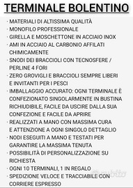 Salve, realizzo a mano, con passione, terminali per bolentino costiero e per bolentino di profondità. Terminali realizzati con perline 4 fori / tecnosfere, per scaricare tutte le torsioni ed evitare grovigli. Potete scegliere voi stessi sia il modello di amo che le dimensioni. Se si acquistano 10 terminali, io ne aggiungo 1 in più in regalo. Se volete acquistare attraverso questo sito per sentirvi più tutelati e più tranquilli, potete tranquillamente contattarmi e dirmi quali e quanti terminali desiderate, a quel punto io creerò un annuncio che contiene tutto quello che mi avete chiesto, e voi potrete acquistare tranquillamente attraverso il sito. Per informazioni potete contattarmi al tre-otto-nove-nove-sei-nove-sei-sei-otto-sei. Saluti