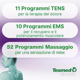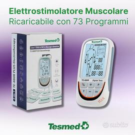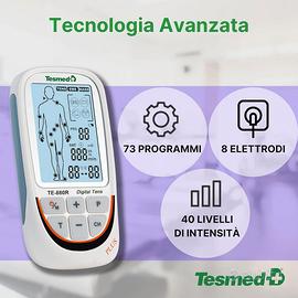 TESMED TE-880R Plus elettrostimolatore Muscolare Ricaricabile, EMS, TENS, Massaggio: 73 programmi di Cui 2 Personalizzabili - Funziona con 8 elettrodi RICARICABILE – COMPLETO E MULTIFUNZIONE Dispositivo per elettrostimolazione muscolare con 73 programmi preimpostati, progettati per un’ampia varietà di utilizzi: 11 programmi TENS, 10 programmi EMS e 52 programmi MASSAGE. L’ampia scelta consente di adattare l’utilizzo a diverse esigenze, sia muscolari che di rilassamento. Funziona con batteria ricaricabile integrata. Controindicato in presenza di pacemaker, gravidanza, epilessia, patologie cardiache gravi e tumori nella zona di trattamento. Leggere il manuale prima dell'uso. TECNOLOGIA TESMED AVANZATA Dotato di 40 livelli di intensità regolabile e 2 programmi personalizzabili, che consentono di impostare manualmente frequenza e ampiezza dell’impulso in base alle esigenze individuali. Il dispositivo può essere utilizzato con 8 elettrodi contemporaneamente, permettendo l’applicazione su aree muscolari estese o su due zone distinte allo stesso tempo. ALLENAMENTO E TONIFICAZIONE MUSCOLARE Grazie alla tecnologia EMS, TE-880R Plus stimola in modo mirato addominali, glutei, gambe, braccia, bicipiti, tricipiti e altri gruppi muscolari, con programmi dedicati alla tonificazione. L’intensità regolabile su 40 livelli consente di personalizzare ogni sessione, fino a raggiungere una stimolazione muscolare intensa. BENESSERE LOCALIZZATO CON STIMOLAZIONE TENS La funzione TENS utilizza impulsi elettrici a bassa frequenza ed è una tecnologia comunemente impiegata anche in ambito fisioterapico, laddove si desidera intervenire su zone soggette a fastidi muscolari e sensazioni dolorose. MASSAGGIO RILASSANTE – PERSONALIZZABILE E MIRATO Tesmed TE-880R Plus offre programmi di stimolazione a bassa frequenza con effetto massaggiante. Ogni programma permette di scegliere tra quattro modalità diverse, per una stimolazione personalizzata. Funziona con 2 cavi quadripolari, 2 canali indipendenti