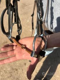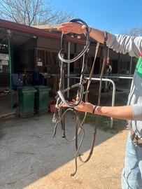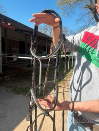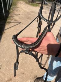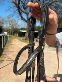 Testiera Pariani nera con borchie, filetto snodato in rame, redini. Testiera usata ma ancora in buone condizioni.