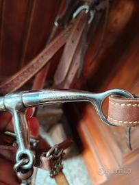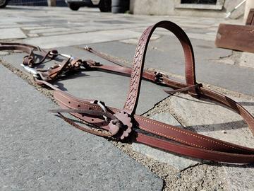 Vendo testiera western in cuoio marrone completa di morso a leve con cannone snodato e rullo centrale da 13.5 cm. Inclusa catenella barbazzale e redini. per foto in più chiedete pure