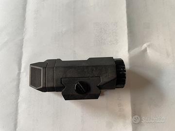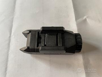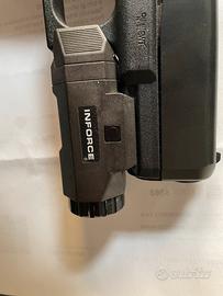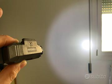 Torcia tattica sotto canna 400 lumen Inforce APL Peso: 85g con batteria CR123A Dimensioni: Lunghezza: 80mm altezza: 35 mm, larghezza: 30mm Impermeabile anche in profondità Ambidestra 400 lumen LED Autonomia dichiarata: 1.4h Potentissima torcia sotto canna da 400 lumen di marca Inforce, modello APL, pesa pochissimo, sporge pochissimo rendendola compatibile con molte fondine per pew pew con torcia, al contrario di torce ingombranti di altri marchi noti). Ha due meccanismi di funzionamento distinti: pressione continua: luce finché non si molla; pressione breve: luce continua fino a nuova pressione breve. Unica usura nella ghiera del led