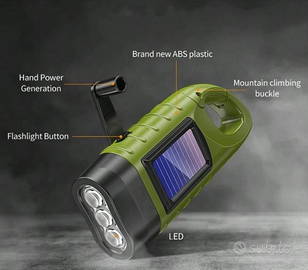 Vendo bellissima torcia da campeggio o sport potentissima, con 3 led, gancio per escursionisti, a ricarica solare oppure tramite dinamo. nuova, ancora inscatolata. vedi foto. ovviamente è in italia e consegno anche a mano se volete. super affare!