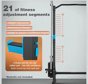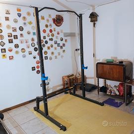 Rack, Torre multifunzione per squat, trazioni e panca piana per il petto.