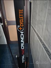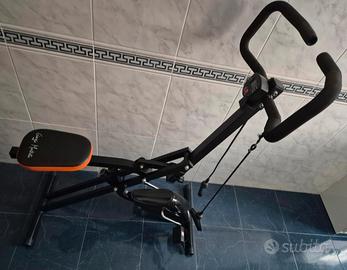Attrezzo fitness multifunzione per allenare tutto il corpo. Struttura in metallo nero. Sedile imbottito nero con bordi arancioni. Manubrio imbottito nero. Display digitale. Ottime condizioni.