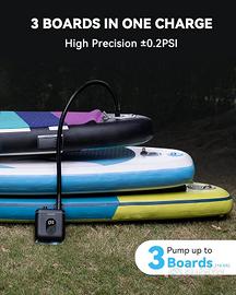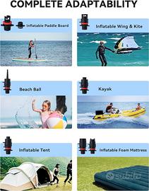 Compatibilità Versatile: La nostra pompa elettrica per paddle board è dotata di un set completo di ugelli, rendendola perfetta per SUP, kayak, materassi ad aria, ali e aquiloni, tende gonfiabili e altro ancora. Che tu stia partendo per un campeggio o una vacanza al mare, la nostra pompa sarà il tuo compagno di viaggio ideale.