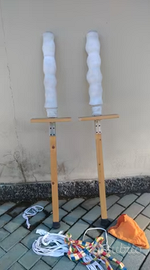 Trampoli artigianali con imbottitura in gommapiuma. Altezza totale 132 cm, base di appoggio piede a 78 cm da terra. Fatti per una persona alta 1,75 e usati pochissimo.