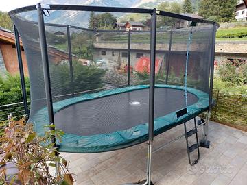 Maxi Pack Trampoline Ovalie 490 con rete + Scala + Kit di ancoraggio + Copertura premium + Tavola freeestyle + Canestro da basket. Copertura premium + Cuscino di protezione + Rete in tessuto CAMBIATI SCORSO ANNO