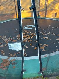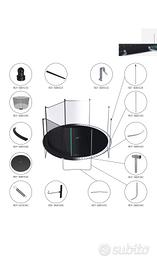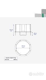 Diametro totale: 4,20 m. Altezza totale: 2,75 m. Peso totale: 72 kg. Dimensioni del telo di salto: 11,1 m² (⌀ 3,77m).