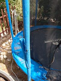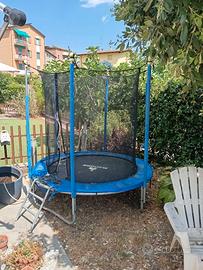 Trampolino elastico, diametro di 180 cm, con scaletta per salire. Come da foto, parti in gomma e copri molle un pò usurate, struttura integra. Smontaggio e trasporto a carico dell'acquirente.