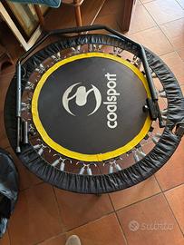 Trampolino superjump di Jill Cooper è perfetto per ritrovare la forma fisica , questo trampolino misura diametro 111 cm. Il trampolino è richiudibile dotato di 8 gambe cromate il tappeto centrale è di 77 cm cuciture rinforzate e supportato da 40 molle sostiene un peso di 130 kg più borsa contenitore e maniglione per sostegno
