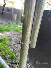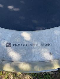 Trampolino elastico Domyos diametro 240 La struttura è solida e anche le protezioni dei pali. Occorre sostiture copri molle e rete di protezione. Direttamente da Decathlon o si trovano versioni compatibili più economiche anche su Amazon. Smontaggio e ritiro a carico dell’acquirente.