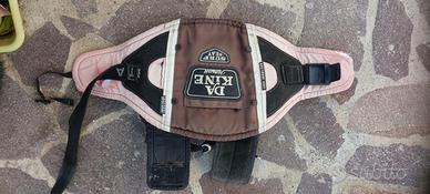 Trapezio Dakine misura "L" abbastanza usurato e vissuto ma ancora funzionale, includo il gancio in metallo. Un trapezio da seduti si posiziona intorno ai fianchi e alle gambe, consentendo di sedersi in modo più agganciato al trapezio. Il vantaggio di un trapezio da sedile è che non scivola verso l'alto ed è più solido perché il trapezio si adatta alle vostre gambe.