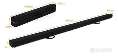 La trave da ginnastica è sicura e robusta, con anima in legno e rivestimento in schiuma EPE. Ha un fondo antiscivolo e una superficie effetto pelle scamosciata, resistente e morbida. È pieghevole e facile da trasportare, adatta anche all’uso esterno. Grazie alla lunghezza di 210 cm e all’altezza di 10 cm, è ideale per utenti di ogni livello, dai bambini ai più esperti.