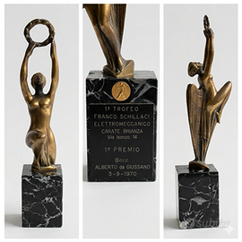 Trofeo, coppa Franco Schillaci torneo elettromeccanico in bronzo su base di marmo Si tratta di una competizione di bocce, sport molto radicato nella tradizione lombarda. La scultura raffigura una figura femminile alata e stilizzata che si tende verso l'alto reggendo una corona d'alloro, classico simbolo di trionfo e gloria. anno 1970 primo premio base cm. 8x7x12 altezza complessiva 41 cm. ben conservato C00010486-660