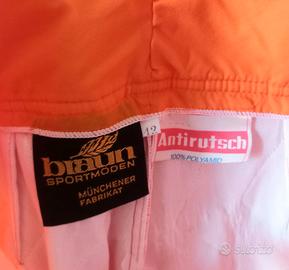 tuta da neve donna taglia 42 (M) del brand Braun Sportmoden, antiscivolo ed in poliammide al 100%; misure: larghezza fianchi 47 cm, lunghezza 146 cm partendo dalle spalline (lunghezza senza spalline 115 cm); colore: arancione; usata ma ben conservata