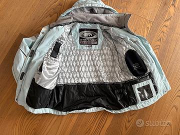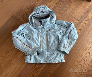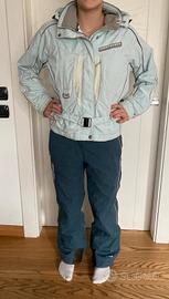 Giacca con cappuccio removibile colore azzurro chiaro. Pantaloni colore blu petrolio (ottanio). Taglia M