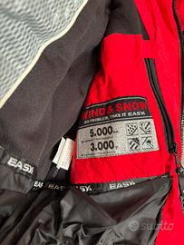 Giacca rossa con fasce bianche e nere, in ottime condizioni sia gli interni che gli esterni, usata solamente una stagione. Tessuto adatto anche a vento e neve pesanti. Cappuccio rimovibile.