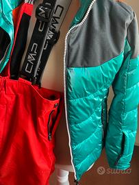 Tuta da scii bambino / bambina taglia 12/14 anni fino a 155 cm , si compone da giacca imbottita ed impermeabile , colore verde e salopette arencio semore imbottita e impermeabile , marca CMP, usatavsolo 3 volte per una settimana bianca, sostanzialmente nuova