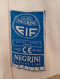 Lotto di una divisa di scherma completa, comprendente corazetta, giacca e pantaloni, tutto taglia 50 (o XL), da dona, destra,omologato Negrini Fencing Line (2015 e 1999), made in Italy.