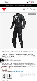 Vendo tuta in pelle Dainese Laguna Seca due pezzi (unificabile tramite zip) usata pari al nuovo, l’ho usata per sole due uscite perché è stato un regalo.