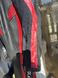 Vendo tuta da moto intera in pelle MTHECH rossa e nera taglia m/s , usata una quindicina di volte in strada, una in pista dove son caduto come si vede in foto i segni della caduta 20 km/ n in curva.