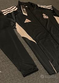 Tuta Real Madrid elegante e sportiva, modello total black con dettagli chiari a contrasto. Vestibilità comoda, ideale sia per allenamento che per uso quotidiano. Perfetta anche per outfit streetwear grazie al design pulito e al logo iconico del Real Madrid.