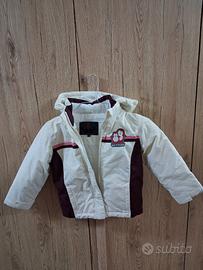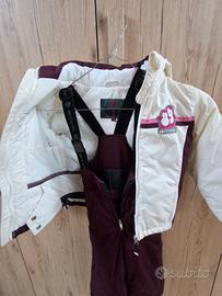 BITING COMPLETO SCI taglia 98 cm: giacca con cappuccio bianca con bordo rosa e bordeaux + pantalone salopette unisex bordeaux regolabile in lunghezza.