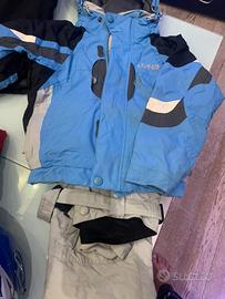 1 giacca azzurr. e pantalone grigio 6/8 anni, 1 giacca e pantalone rosso 8/10 anni , scarponcini, guantini, caschetto con visiera, 3 felpe. Tutto in condizioni perfette, o in stok o separatamente