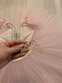 Tutù per esibizione/spettacolo rosa con paillettes. Le maniche sono state aggiunte dopo ma si possono rimuovere.