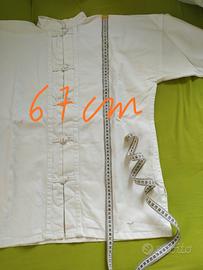 Uniforme Kung Fu Shaolin JK SPORTS taglia 3/160 100% cotone usato pochissimo in ottime condizioni. Il pantalone è largo 52 cm e lungo 91 cm. La manica da inizio collo a fine manica è lunga 65 cm. La giacca da spalla a spalla è lunga 64 cm ed è lunga 64 cm.
