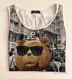 Se non vuoi passare inosservato, questa canotta è il pezzo che manca al tuo guardaroba. Un mix perfetto tra l'estetica hip-hop anni 2000 e il comfort moderno. Stampa "Bad Teddy" con catena gold e bling-bling su sfondo urban. Tessuto a rete (mesh) tipo basket, perfetto per le giornate calde o per i festival. Spacca portata sopra una t-shirt bianca oversize o da sola per un look più bold. Circonferenza sotto ascelle cm 102 circonferenza sotto cm 104 lunghezza dalla spalla cm 67