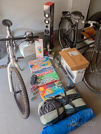 due biciclette un paio di scarpe da donna 4 Giochi di società un rompi chiacio 2 tende da campeggio 2 canne da pesca 1 piccolo quadro 1 porta cellulare per andare a correre 2 piccole sveglie da comodino 1 lampadario 1 robo che spazza e lava bisogna cambiare la batteria. non spedisco niente se siete interessati mi chiamate è ci mettiamo d'accordo per venire a vederli il tutto per 150 euro trattabili 3472138853 Luigi.