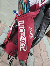 Vela Flexifoil mod Fusion 15 m2, colore Rasta (rosso verde giallo e nero), con sacca zaino rosso bordeaux.