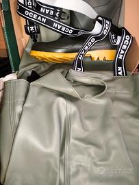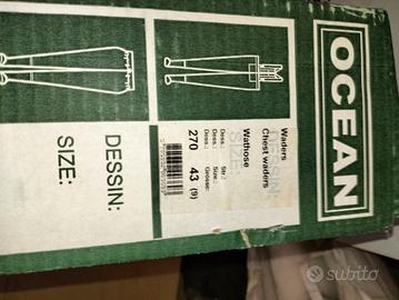 vendo (waders) della marcaOcean, specificamente il modelloClassic 270. Questi trampolieri ascellari sono progettati per la pesca e il lavoro in ambienti acquatici impegnativi, offrendo protezione fino al petto. Modello:Ocean Classic Chest Waders (Art. 2-70). Taglia:43 EU (corrispondente alla taglia 9 UK). Materiale:Realizzati in robusto PVC (circa 490-500 g/m²) con interno in morbido cotone lavabile. Impermeabilità:Resistenza a una colonna d'acqua di 20.000 mm. Bretelle elastiche con fibbie di sicurezzaFixlock. Tasca interna sul petto per piccoli oggetti. Stivali integrati di alta qualità con suola a carrarmato (cleated sole) per una buona aderenza su terreni fangosi. Cuciture saldate ad alta frequenza per garantire la massima durata Questi waders sono noti per essere particolarmente resistenti all'usura, al grasso e agli oli, rendendoli ideali non solo per la pesca sportiva ma anche per agricoltura e lavori industriali.