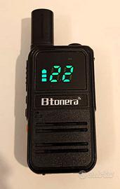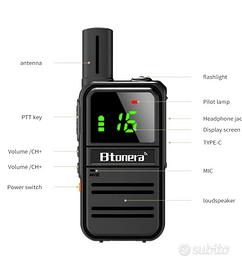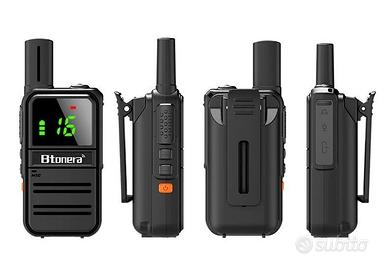 Coppia di mini-walkie talkie Btonera BT500. Piccolissima e leggera, bidirezionale, sta in una mano ed è facile da trasportare, lungo tempo di utilizzo (grazie alla capacitá della batteria). Nonostante le dimensioni ha tutte le caratteristiche di potenza, buona ricezione e durata di un normale ricetrasmittente PMR446, ottima quindi per lavoro, sport ed hobby e può essere ricaricata tramite USB C. Portata: 5km Intervallo di frequenze: 400-480MHz Numero Canali: 22 Potenza di uscita: 2W Capacità della batteria: 3800mAh Dimensioni (escl.antenna): 85x45x25mm Attacco tipo Kenwood/Baofeng peso: 122g Colore: nero Il pacchetto include: - 2 radio con batteria - 1 caricabatterie USB - 1 cavi di ricarica doppia USB C - 2 clip da cintura - 1 manuale N.B.: già programmate con i 16 canali liberi PMR446 + 6 canali LPD (di solito quelle reperibili sui siti online non sono programmate con le frequenze legali in Europa). Posso fornire (su richiesta) cavo altoparlante-microfono e/o cavo auricolare-microfono.